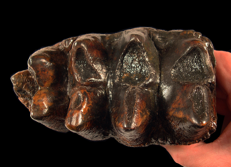 One of the easiest ways to distinguish a mastodon tooth from other Ice Age fossils is to observe its structure. Mastodon molars typically display fewer but more prominent “wedge-like” cusps than mammoth teeth, arranged in a pattern that reflects their plant-based diet. The enamel is thick, and the roots are often visible and fused—traits that separate them from look-alikes.