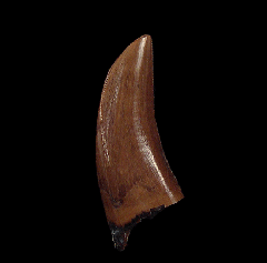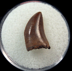 A Top Quality Tyrannosaur tooth from the late Cretaceous (Campanian) in northern North America. An October Fossil of the Month. Please note that this tooth could Gorgosaurus or Daspletosaurus - see Detailed Discussion below. This tooth measures 2-3/8" - an excellent Tyrannosaur tooth. The enamel is high quality with excellent color. Anterior serrations and posterior serrations are excellent. Serrated to the tip. Note - the top has some minor planting etching and there is one natural wear facet on the side (very typical for the Campanian Tyrannosaurs). No cracks, repair or restoration. Legally collected on private land in the Judith River Fm., McCone Co., Montana. Probably an excellent Gorgosaurus tooth based on size and roundness of the tooth cross-section. Also found at a site that produced a Gorgosaurus skeleton. Authenticity guaranteed. An excellent BIG tooth. A Riker display frame is included.