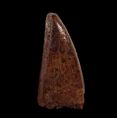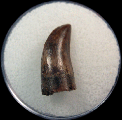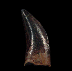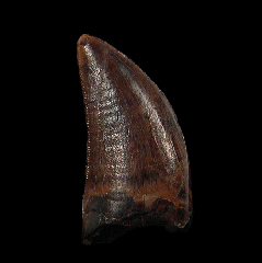 A LARGE, Top Quality Tyrannosaur tooth from the late Cretaceous (Campanian) in northern North America. Please note that this tooth could Gorgosaurus or Daspletosaurus - see Detailed Discussion below. This tooth measures 2-1/4" - an excellent Tyrannosaur tooth. The enamel is high quality with excellent color. Anterior and posterior serrations are excellent. Serrated to the tip with small wear facet on tip and the side. Wide base. No crack, repair or restoration. Legally collected on private land in the Judith River Fm., Fergus Co., Montana. Probably an excellent Gorgosaurus or Daspletosaurus tooth based on size and roundness of the tooth cross-section. Authenticity guaranteed. An excellent collector's tooth. A Riker display frame is included.