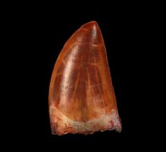 A Top Quality Carcharodontosaurus saharicus tooth from the Kem Kem deposits of Morocco. An excellent tan & red colored tooth. An incredibly colored tooth! Highest quality enamel. Excellent preservation. Excellent anterior and posterior serrations. Serrated to the tip. Extra wide root. This tooth was from a large dinosaur. No cracks. No repair or restoration. A Top Quality collector's tooth. Authenticity Guaranteed. A fantastic colored Carch tooth! A floating frame display case is included.
