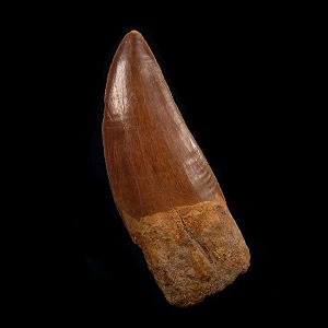 An EXTRA LARGE, Top Quality Carcharodontosaurus saharicus tooth from the Kem Kem deposits of Morocco. An excellent dark red colored tooth. Highest quality enamel. Excellent preservation. Excellent anterior and posterior serrations. No tip wear. Two cracks. No restoration. A Top Quality collector's tooth. Authenticity Guaranteed. An excellent BIG Carch tooth!