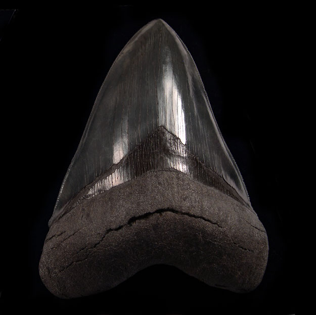A rare, High Quality, 6-1/2" Megalodon tooth - an upper jaw tooth from South Carolina. An excellent Dark Gray colored crown. High quality enamel. The bourlette is a nice dark brown color. The serrations are large and sharp. The root is charcoal color, nicely articulated, extra wide (5-1/8"), and complete with typical cracks. No repair or restoration. Authenticity guaranteed.  A top quality color collector's Megalodon tooth. A BIG serrated Megalodon tooth. Rare size!   Note - Tooth comes with a custom stand. See photo #4.