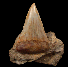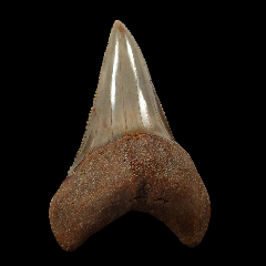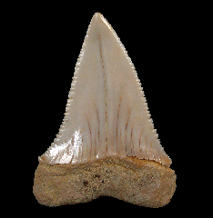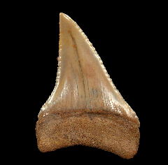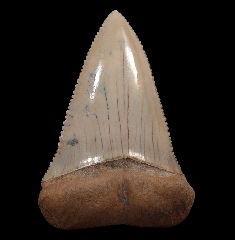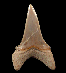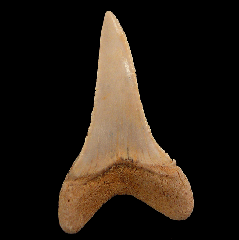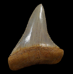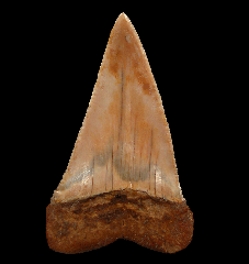 A Top Quality Tan colored Megalodon tooth from So. Carolina with frame. Excellent enamel, color, and serrations. A little GEM! These Megalodon teeth are great for gifts, class room, or starting your fossil shark tooth or Megalodon collection.  These Megs are Miocene age - about 15 MYA (Hawthorne Fm.) from So. Carolina unless otherwise marked. No repair or restoration.   Authenticity guaranteed.  Note - All larger "First Megalodon" teeth come with a 3"x 4" Riker frame with label (as photographed) plus an identification card.  Note - Be sure to see all of our My First Megalodon offerings.