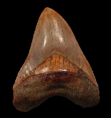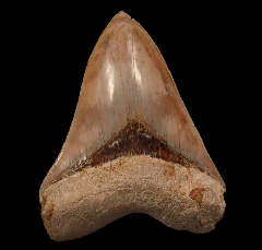 A HIGH QUALITY Megalodon - upper jaw tooth from West Java, Indonesia. This Megalodon has an excellent Tan with red highlights colored crown with a large golden tan colored bourlette. Highest quality enamel. Excellent color! The serrations are razor sharp with a sharp tip serration. The root has some erosion which happens with most West Java Megs. Miocene Age. No repair or restoration. Authenticity Guaranteed.