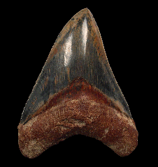 A HIGH QUALITY Megalodon - upper jaw tooth from West Java, Indonesia. This Megalodon has an excellent Tan with brown & red highlights colored crown with a brown colored bourlette. Highest quality enamel. Excellent color! The serrations are razor sharp with a sharp tip serration. The root has some erosion which happens with most West Java Megs. Miocene Age. No repair or restoration. Authenticity Guaranteed.