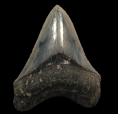 A EXTRA LARGE, HIGH QUALITY Megalodon  - upper jaw tooth from West Java, Indonesia. This Megalodon has an excellent Tan with light brown highlights colored crown with a light brown colored bourlette. Highest quality enamel. Excellent color! The serrations are razor sharp with a sharp tip serration. The root has some erosion on the rear which happens with most West Java Megs. Miocene Age. No repair or restoration. Authenticity Guaranteed.