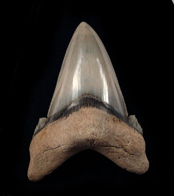 A rare LARGE, Top Quality Otodus sokolovi tooth from Boujdour, Western Sahara, Morocco. Enamel quality is excellent with an excellent large bourlette. The serrations are very sharp with a samll amount of damage including a partial tip serration. The side cusps are complete with uniform serrations - (a younger sokolovi version). The root is massive and complete. Exceptional preservation. This tooth is a Late Eocene age, Aridal Formation (approx. 42 million years ago). No repair or restoration! Authenticity guaranteed.