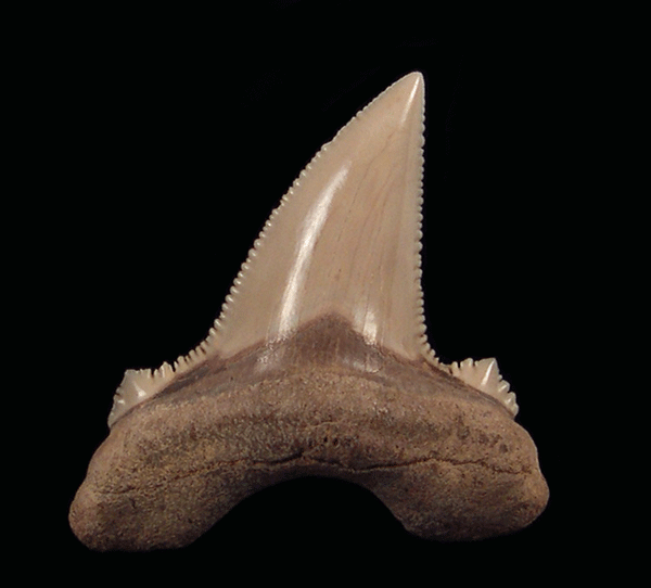 A very rare, early Otodus aksuaticus lateral tooth from Kzil-Orda, Kazakhstan. A transitional tooth leading to O. auriculatus (see detailed discussion below) which leads to Megalodon. A July Fossil of the Month.The bourlette is complete. This tooth exhibits small serrations along the lower 1/2 of the crown and micro serrations to the tip. These teeth exhibit excellent color, gloss, and preservation. A rare, early (Ypresian) Eocene Auriculatus transition tooth. A very challenging tooth to find when building a Megalodon evolutionary set! No repair or restoration. Authenticity guaranteed. This western Kazakhstan site is one of the few places in the world where the Otodus obliquus to Otodus auriculatus transition can be found in adjacent geologic layers.