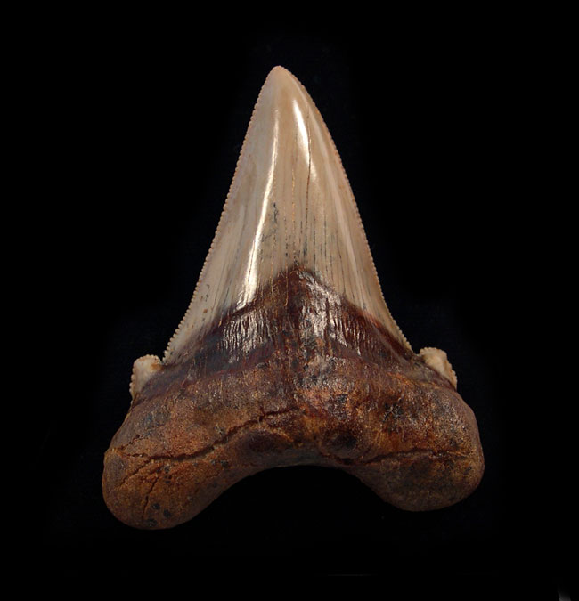 A very rare, EXTRA LARGE Auriculatus lateral tooth from Peru with a tan crown and brown root. The serrations are very nice - large and razor sharp. Excellent side cusp development. Excellent preservation. The only challenge with this tooth is a root break was repaired. These Peruvian Rics are very rare! You cannot find them any more. Authenticity guaranteed.