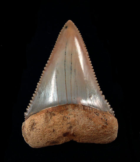 A GEM, Great White shark upper jaw anterior tooth from Chile. This tooth has an excellent blue crown and a tan colored root. Exceptional color! Killer serrations - large! Excellent preservation - note the preserved nutrient hole on the root. A perfect tooth. Authenticity guaranteed.