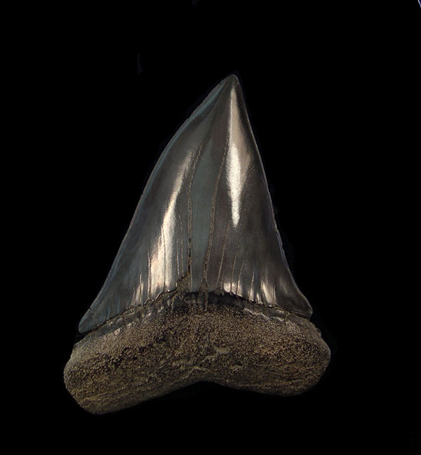 An EXTRA LARGE, TOP QUALITY Isurus hastalis, but renamed to Cosmopolitodus hastalis as a Great White shark ancestor. An October Fossil of the Month. Highest quality enamel. A very glossy Jet BLACK colored crown with small hydration cracks. Excellent color! Exceptional cutting edges with no dings. An exceptional root – very wide no small hydration cracks. Great symmetry. No repair or restoration. An exceptional collector's BIG Mako tooth! Museum Quality. Authenticity guarantee.