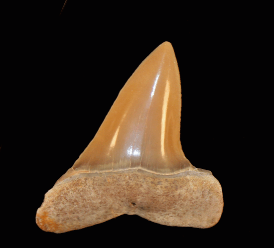 A Top Quality Isurus praecursor, the earliest Mako shark, tooth from the phosphate mines of Hahotoe, Togo. An upper lateral tooth. Note - there is a "wedge shaped" bite mark on the side of the root! Excellent color and preservation. This tooth is Lutetian age (45 MYA), lower middle Eocene. No repair or restoration. Authenticity guaranteed.