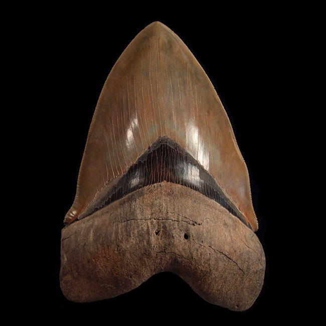 An ultra rare, TOP QUALITY, Megalodon - upper jaw anterior tooth from West Java, Indonesia - new site. This Megalodon has an incredible dark tan color and an excellent orange - brown colored bourlette. Highest quality enamel. Great color! The bourlette is large and essentially complete. The serrations are razor sharp with an excellent tip serration. Excellent serrations for a BIG Meg. The root is excellent - nicely articulated with dark brown color on the display side and shallow pitting on the non-display side which is all to common for these Megs. Miocene Age. No repair or restoration. Authenticity Guaranteed. A rare Indonesian Meg tooth. An excellent West Java color Meg. Note - This tooth comes with a custom display stand as shown in the final photo.