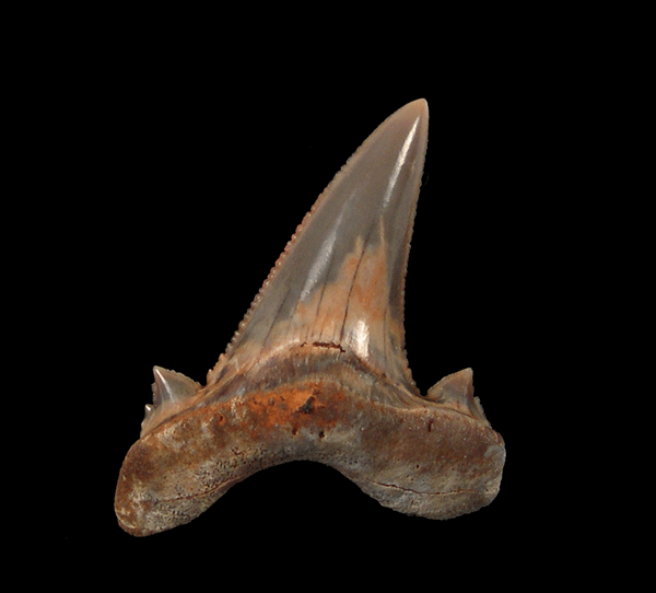 A very rare, early Otodus aksuaticus lateral tooth from Kzil-Orda, Kazakhstan. A transitional tooth leading to O. auriculatus (see detailed discussion below) which leads to Megalodon. A July Fossil of the Month.The bourlette is complete. This tooth exhibits small serrations along the lower 1/2 of the crown and micro serrations to the tip. These teeth exhibit excellent color, gloss, and preservation. A rare, early (Ypresian) Eocene Auriculatus transition tooth. A very challenging tooth to find when building a Megalodon evolutionary set! No repair or restoration. Authenticity guaranteed. This western Kazakhstan site is one of the few places in the world where the Otodus obliquus to Otodus auriculatus transition can be found in adjacent geologic layers.