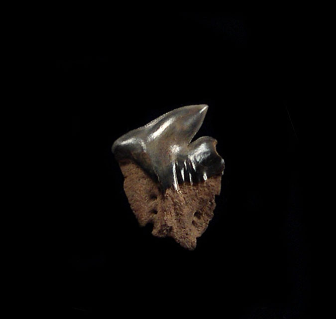 An EXTRA LARGE, very rare, GEM Quality Parotodus benedeni tooth with a massive root from Euhaw Creek, Jasper Co., So. Carolina. A Miocene-Pliocene age tooth from the Hawthorne Fm. Nice Charcoal Gray color. Lateral tooth. Highest quality enamel with razor sharp edges and a "needle-like" sharp tip. Root is complete, thick (11/16"), nicely articulated, and a very small hydration crack. No wear! No repair or restoration. Authenticity guaranteed. A very difficult tooth to locate.