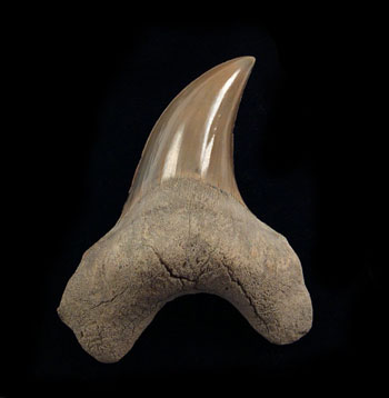 A LARGE, very rare, Top Quality Parotodus benedeni  tooth with a massive root from the Summerville, So. Carolina. A Miocene-Pliocene age tooth from the Hawthorne Fm. Nice tan color. Lateral tooth. High quality enamel with sharp edges and  tip. Root is complete, thick (5/8"), nicely articulated, and a typical hydration crack. No repair or restoration. Authenticity guaranteed. A very difficult tooth to locate from a rare location.