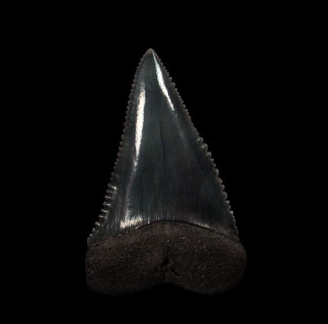 A LARGE, BLACK Top Quality Great White shark tooth - upper jaw anterior tooth from Western Cape Province, So. Africa. This tooth has a black colored crown, a large distinct brown gum line, and a black root. Excellent color! Highest quality enamel with no hydration cracks. Serrations are large and complete with an excellent tip serration. Excellent preservation - note nutrient hole on root. No repair or restoration. A Large BLACK collector's GW tooth for a rare locality. Authenticity guaranteed.